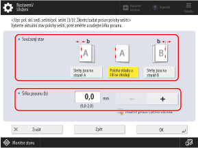 Pomocí ovládacího panelu upravte polohu skladu pro sedlové sešívání a polohu pro sešívání sešívačkou. Nastavení nelze provést prostřednictvím Remote UI (Vzdálené UR) z počítače.