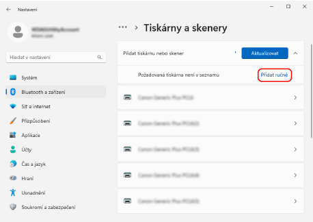 Klikněte na možnost [Přidat ručně] u položky [Požadovaná tiskárna není v seznamu].