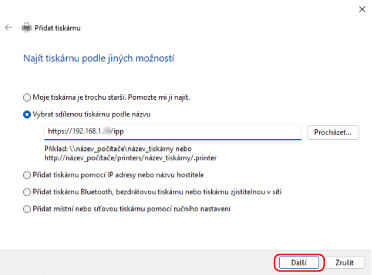 Vyberte [Vybrat sdílenou tiskárnu podle názvu], zadejte místo určení připojení a klikněte na [Další].
