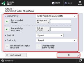 Chcete-li zašifrovat soubor ve formátu PDF, proveďte následující nastavení: Šifrování naskenovaných dat a vytvoření souboru PDF