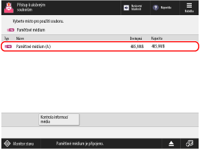 Stiskněte [Kontrola informací média], vyberte paměťové zařízení USB a stisknutím [Detaily] zkontrolujte sériové číslo a dostupnou kapacitu paměťového zařízení USB.