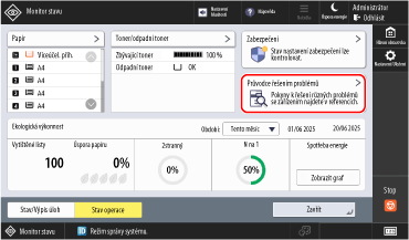 Informace podpory k řešení problémů s tiskem, faxováním a odesíláním naskenovaných dat lze zkontrolovat v nabídce [Průvodce řešením problémů] v provozním stavu přístroje.