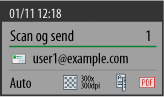 Viser antallet af destinationer, destination*1, oprindelig størrelse, opløsning, 2-sidet og filformatindstillinger.