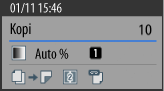 Viser antallet af kopier, kopiforhold, papirkilde, 2-sidet/hæfte, N på 1 og hæfteindstillinger.