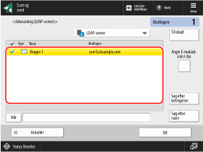 Når brugeroplysninger administreres med en LDAP-server, kan du søge efter disse oplysninger og angive modtagere fra scannings- eller faxskærmen (Scan og send) på betjeningspanelet.