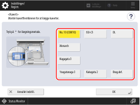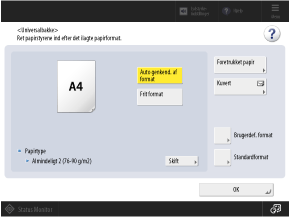 Hvis der isættes papir i en størrelse, der ikke registreres automatisk, eller hvis der vises en anden papirstørrelse, selv efter at papiret er isat, skal du trykke på [Standardformat], og vælge størrelsen på det isatte papir.