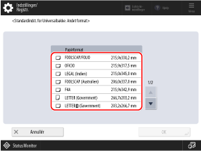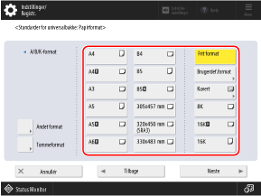 For de papirstørrelser, der vises, når der trykkes på [Andet format] skal du gennemgå følgende: