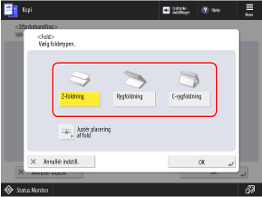 Hvis du trykker på [Rygfoldning] i trin 1, kan du trykke på [Justér placering af fold] for at justere foldepositionen for hver papirstørrelse.