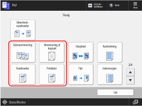 Du kan tilføje oplysninger såsom sidetal og dato, når du kopierer. Du kan også tilføje et vandmærke såsom "CONFIDENTIAL". Du kan også angive en brugerdefineret streng for vandmærket.