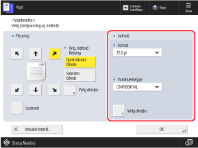 Du kan trykke på [Vælg detaljer] for at ændre de sider, som vandmærket skal udskrives på, eller ændre printmetoden (gennemsigtig eller overlejret udskrivning).