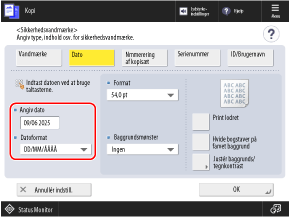 Som standard indtastes datoen, der er indstillet på maskinen. Vil du tilføje en anden dato, skal den indtastes ved hjælp af de numeriske taster.