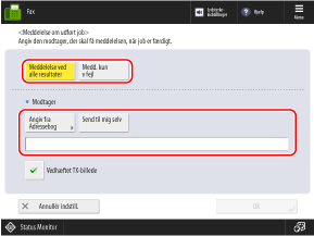 Selv hvis du er væk fra maskinen, når data venter på at blive sendt, kan du kontrollere afsendelsesresultatet fra en computer eller mobilenhed. Indstillingen kan også konfigureres til kun at sende beskeden, hvis der opstår en fejl.