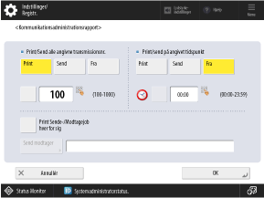 Vælg [Print] eller [Send] for [Print/Send alle angivne transmissionsnr.], og indstil antallet af kommunikationshændelser med knappen til venstre for den indstilling, der trykkes på for at blive valgt.