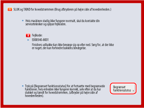 Hvis [Begrænset funktionsstatus] vises på skærmen, kan du trykke på den og fortsætte med at bruge maskinen før fejlfinding. De brugbare funktioner er dog begrænsede.