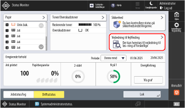 Supportoplysningerne til fejlfinding af problemer med udskrivning, faxning og afsendelse af scannede data kan ses i [Vejledning til fejlfinding] i maskinens driftsstatus.