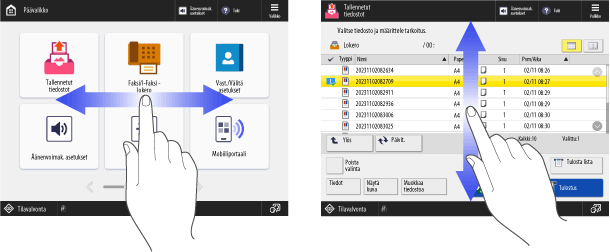Kosketa näyttöä ja pyyhkäise sormenpäälläsi. Näyttö liikkuu siihen suuntaan, johon pyyhkäisit sormella. Esimerkiksi [Päävalikko]-näyttö liikkuu yhden sivun suuntaan, johon pyyhkäisit sormella.