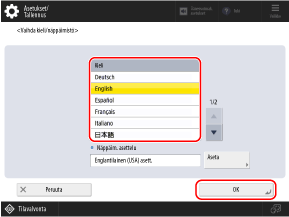Käyttöpaneelia käyttämällä voit vaihtaa näytön kielen. Näytön kieltä ei voi vaihtaa Remote UI (Etäkäyttöliittymä) -sovelluksen avulla tietokoneelta.