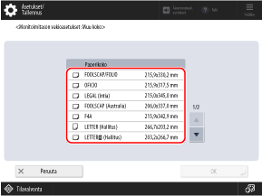 Seuraavat paperikoot näkyvät, kun [Muu koko] painetaan: