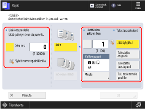 * Kun teet useita kopioita, voit myös lisätä työn erotussivun tietyn kopiomäärän tai kunkin ryhmiteltyjen sivujen sarjan väliin. Kun esimerkiksi teet suuren määrän kopioita, voit lisätä värillisen työn erotussivun tietyn kopiomäärän väliin tai kunkin ryhmiteltyjen sivujen sarjan väliin, jotta voit tarkistaa kopioiden määrän tai kunkin sivuryhmän lopun.