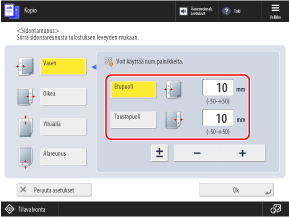 Voit kopioitaessa lisätä marginaalin (reunus) nidontaa tai rei'itystä varten. Voit määrittää reunuksen erikseen paperin etu- ja taustapuolelle.