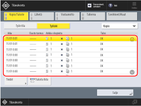Valitsemalla näytön oikeassa yläkulmassa olevasta alasvetovalikosta [Kopio] voit suodattaa luettelon näyttämään vain kopiointityöt.