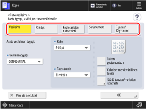* Kun teet säädön käyttämällä kohdetta [Säädä taustan/merkkien kontrasti] [Turvavesileima]-näytössä, [Tulostusasetukset] ja [Alusta] eivät näy.