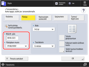 Oletuksena syötetään laitteeseen asetettu päivämäärä. Jos haluat lisätä eri päivämäärän, kirjoita se numeronäppäimillä.