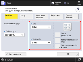 Voit upottaa näkymätöntä taustatekstiä (suojattu vesileima), kuten TOP SECRET tai CONFIDENTIAL, kun kopioit.
