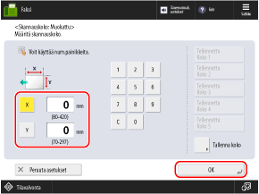 Paina [Tallenna koko]  valitse painike, johon haluat rekisteröidä koon  paina [Tallenna/Muokkaa]  syötä pituudet [X]-puolelle ja [Y]-puolelle  paina [OK]  [Sulje]