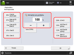 * Jos valitset [Vapaa koko], alkuperäinen voidaan sijoittaa vain syöttölaitteeseen. Lisäksi suhde on kiinteä 1:1 (100 %).