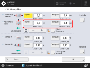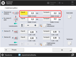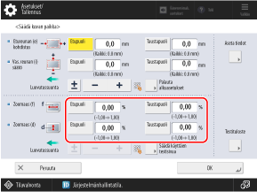 Esimerkki: Jos etupuolen ilmaisimen keskiviiva on 0,6 mm paperin reunan sisäpuolella, aseta [Etupuoli]-arvoksi ”-0,6 mm”.