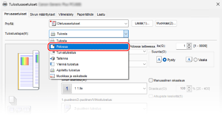 Hae esiin tulostuksen valintaikkuna ja valitse laitteen tulostinohjain.