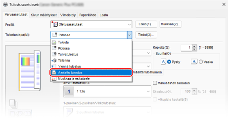 Voit määrittää Ajastettu tulostus (Scheduled Print) -asetuksen ajurin tulostusasetuksista ja lähettää tulostustiedot laitteeseen.