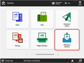 * Voit myös skannata asiakirjan kohteesta [Tallennetut tiedostot] [Päävalikko]-näytössä ja tallentaa sen USB-tallennuslaitteeseen. Tietojen tallentaminen [Tallennetut tiedostot] -kohdassa on hyödyllistä, jos haluat tulostaa tiedoston välittömästi laitteella.