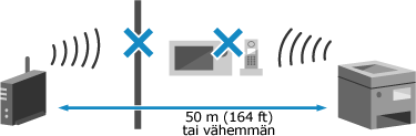 Laite ja langaton LAN-reititin tulee asentaa paikkaan, jossa ei ole seiniä tai muita esteitä laitteiden välillä ja alle 50 metrin (164') etäisyydellä toisistaan.