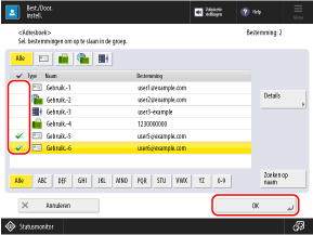 Als u de informatie van een bestemming wilt controleren, selecteert u de bestemming en drukt u op [Details].