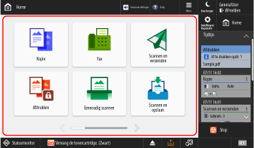 U kunt [Opdrachtstatus/Log] selecteren om de verwerkingsstatus en geschiedenis van elke functie en de resterende hoeveelheid verbruiksmaterialen en onderdelen te controleren.