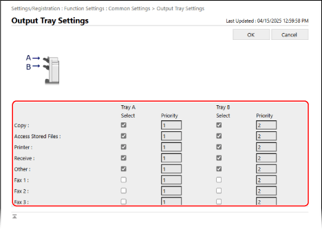 U kunt ook meerdere uitvoerladen voor elke functie opgeven en de prioriteit opgeven. In dit geval schakelt de uitvoerbestemming automatisch over naar een lade met een lagere prioriteit wanneer het opvangblad met de hoogste prioriteit de capaciteit bereikt.