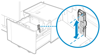 Plaats de Side Guide Plate Fixing Bracket-A op het papiermagazijn door de positioneringspen in de bijbehorende opening te steken.