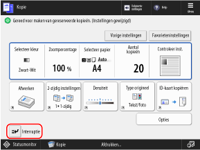 U kunt andere kopieer- of afdrukbewerkingen die worden uitgevoerd of die wachten om te worden uitgevoerd, onderbreken en kopiëren. U kunt ook normale kopieerbewerkingen uitvoeren om een gereserveerde kopieeropdracht te maken en er later andere bewerkingen mee onderbreken.