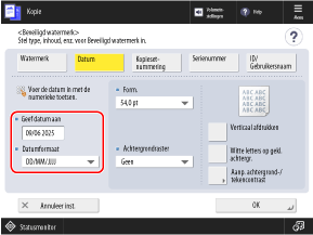 Standaard is de datum ingevoerd die op de machine is ingesteld. Als u een andere datum wilt toevoegen, voert u deze met behulp van de cijfertoetsen in.