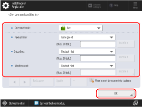 Als u een faxbestemming opgeeft als doorstuurbestemming of opslaglocatie, worden het subadres en wachtwoord die voor de bestemming zijn ingesteld, uitgeschakeld.