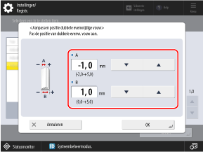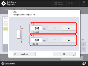 Pas de waarde [A] aan om de rechterrand van het bovenste overlappende oppervlak naar rechts te verschuiven, of pas de waarde [B] aan om de positie van de rechtervouw naar rechts te verschuiven.