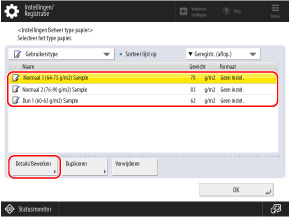 Selecteer het aangepaste papier uit de lijst en druk op [Details/Bewerken].