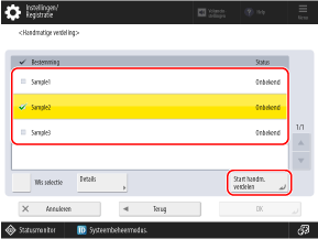 Schakel de selectievakjes voor de bestemmingen in en druk op [Start handm. verdelen].