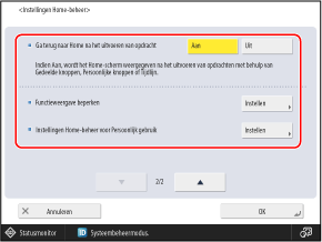 Om de items te beperken die elke gebruiker kan aanpassen op het scherm [Home], drukt u op [Instellen], selecteert u [Uit] voor elk item dat u wilt beperken en drukt u vervolgens op [OK].