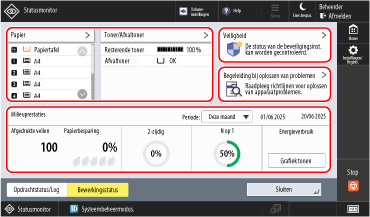 U kunt een scherm weergeven om de status van meerdere opties tegelijk te controleren, zoals de resterende hoeveelheid papier en toner, de status van de beveiligingsmaatregelen van de machine, ondersteuningsinformatie voor het oplossen van problemen tijdens faxen en afdrukken, en de afdrukopdrachtstatus en het energieverbruik binnen een opgegeven tijdsperiode.