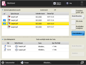 In dit scherm kunt u de documenten die in de wachtstand staan controleren en afdrukken. U kunt ook elk document dat in de wacht staat naar de Mailbox verplaatsen of kopiëren, en het opdrachtticket bewerken of controleren.