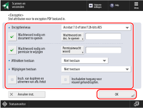 Om een PDF-bestand te versleutelen, configureert u de volgende instellingen: Gescande gegevens versleutelen en een PDF-bestand maken