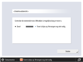 Verwijder het meldingsscherm voor resterende toner dat wordt weergegeven wanneer [Weergave foutmelding resterende toner] is ingesteld op [Aan].